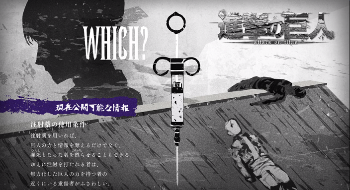 注射薬を用いれば、巨人の力と情報を奪えるだけでなく、瀕死となったものを甦らせることもできる。