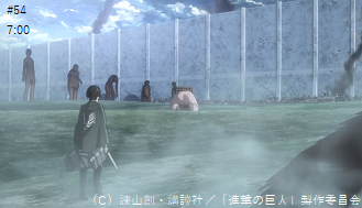 8:03壁の向こう側では痩せてきた超大型巨人を見てアルミンが作戦を思い立ち指示を出す。
