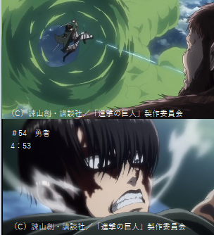 19:14超大型巨人戦。終わったと思いエレンを見ると全身硬質化したエレンが…その瞬間生身のエレンが立体機動装置で超大型巨人の首に近付きベルトルトを抉り出した
