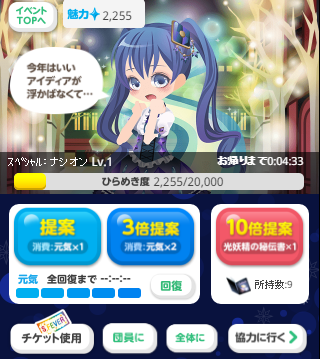 とりあえず「開花」させることでアイテム&ポイントが入るイベントです。 (1)まず「たね」なし状態からスタート (2).水やりでたね(+メダル1枚)ランダム出現します (3)水やりで新しいたね(+メダル1枚)、開花時間10分短縮 出現 (4).開花でポイントとアイテム取得 (画像入り詳細→こちらにて) |