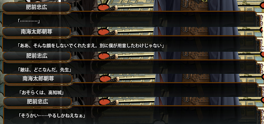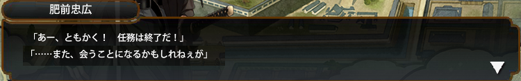 一時帰城「ふむ。状況をよく見て判断したまえ」戻り「落ち着いて行きたまえ」 |