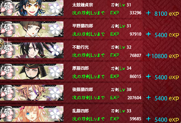 敵4~5体(刀装1)360/540/720exp・ボス5体(刀装2)780/1170/1560exp 遠戦なく弱め