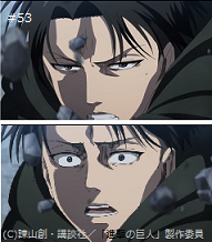6:06 新兵に指示する時。普通なら口パクだけで終わりそうな短いシーンなのですが、カット数?がめちゃ多くて、細かく何枚も表情と仕草が書かれていて丁寧です…表情が変わる様子まで0.何秒で描かれていて…兵長愛なのか稼ぎ頭への責任感なのかすごく仕事量が多いと思います。こちらとしては一時停止してして見る意味が沢山ありDVDで見るお得感があると思いますw