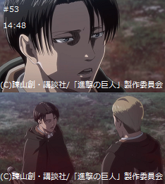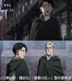冒頭 兵長の事じゃないのですが、コニーの「エレンの家ぇぇがあああアハハハ」でジャンがサシャにコニーを少し殴らせるシーン入っててよかった…ちょっぴりほっこり…ほんとは日本語のダジャレが通じるって言語的にどうなってるんだろうと考えなくもないですが有って良かった見れて良かった☆